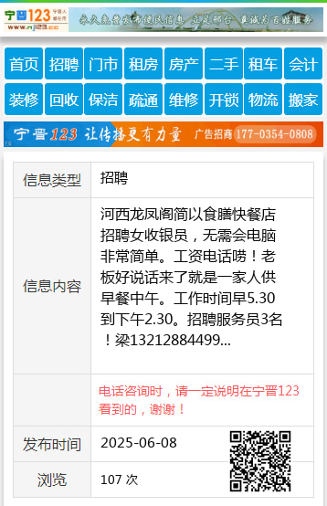 河西龙凤阁简以食膳快餐店招聘女收银员,无需会电脑非常简单。工资电话唠!老板好说话来了就是一家人供早餐中午。工作时间早5.30到下午2.30。招聘服务员3名!梁13212884499 【电话咨询时,请一定说明在伊春信息网看到的,谢谢!】 |