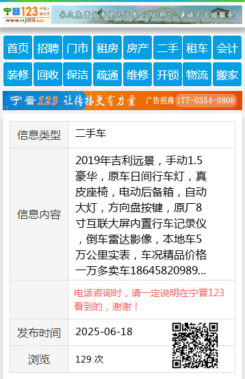 2019年吉利远景,手动1.5豪华,原车日间行车灯,真皮座椅,电动后备箱,自动大灯,方向盘按键,原厂8寸互联大屏内置行车记录仪,倒车雷达影像,本地车5万公里实表,车况精品价格一万多卖车18645820989 【电话咨询时,请一定说明在伊春信息网看到的,谢谢!】 |