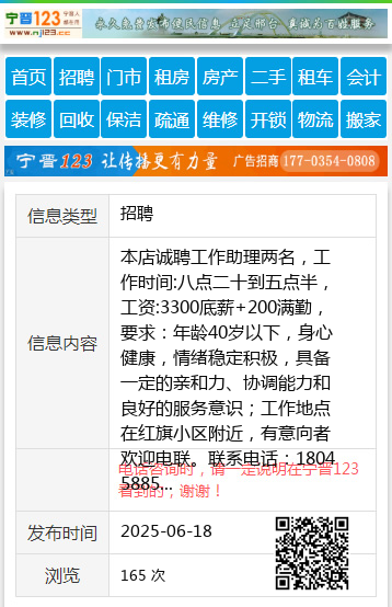 本店诚聘工作助理两名,工作时间:八点二十到五点半,工资:3300底薪+200满勤,要求:年龄40岁以下,身心健康,情绪稳定积极,具备一定的亲和力、协调能力和良好的服务意识;工作地点在红旗小区附近,有意向者欢迎电联。联系电话:18045885689王18045885689 【电话咨询时,请一定说明在伊春信息网看到的,谢谢!】 |