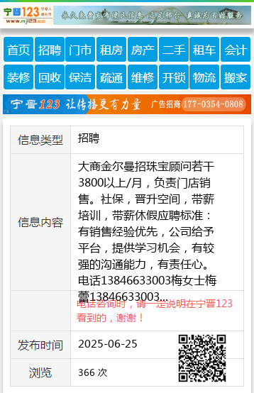大商金尔曼招珠宝顾问若干3800以上/月,负责门店销售。社保,晋升空间,带薪培训,带薪休假应聘标准:有销售经验优先,公司给予平台,提供学习机会,有较强的沟通能力,有责任心。电话13846633003梅女士梅蕾13846633003 【电话咨询时,请一定说明在伊春信息网看到的,谢谢!】 |