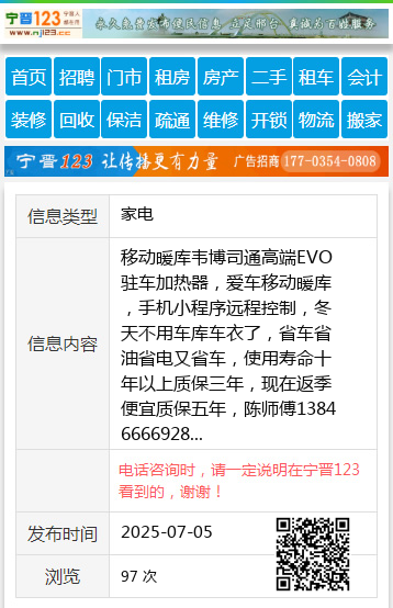 移动暖库韦博司通高端EVO驻车加热器,爱车移动暖库,手机小程序远程控制,冬天不用车库车衣了,省车省油省电又省车,使用寿命十年以上质保三年,现在返季便宜质保五年,陈师傅13846666928 【电话咨询时,请一定说明在伊春信息网看到的,谢谢!】 |