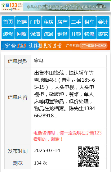 出售本田锋范,捷达轿车等雪地胎4只(普利司通185-65-15),大头电视,大头电视柜,微波炉,餐桌,单人床等闲置物品,低价处理,物品在龙栖湾。陈先生13846628918 【电话咨询时,请一定说明在伊春信息网看到的,谢谢!】 |