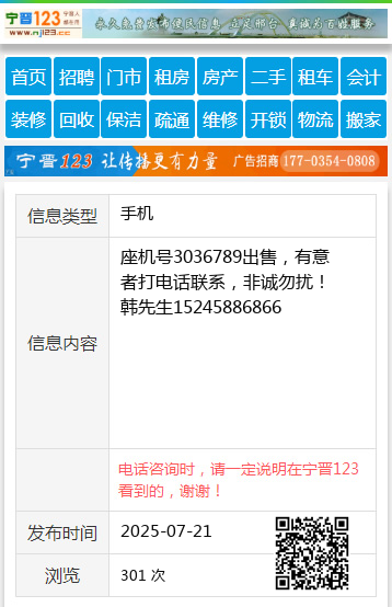 座机号3036789出售,有意者打电话联系,非诚勿扰!韩先生15245886866