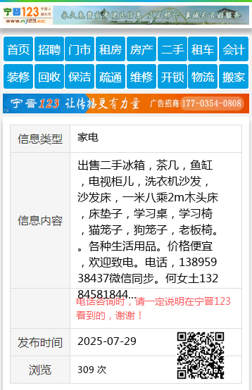 出售二手冰箱,茶几,鱼缸,电视柜儿,洗衣机沙发,沙发床,一米八乘2m木头床,床垫子,学习桌,学习椅,猫笼子,狗笼子,老板椅。。各种生活用品。价格便宜,欢迎致电。电话,13895938437微信同步。何女土13284581844 【电话咨询时,请一定说明在伊春信息网看到的,谢谢!】 |