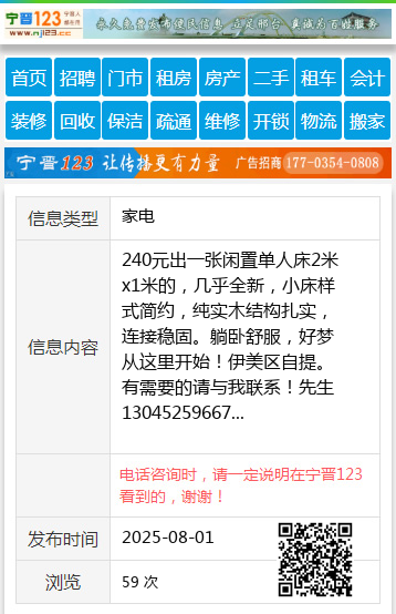 240元出一张闲置单人床2米x1米的,几乎全新,小床样式简约,纯实木结构扎实,连接稳固。躺卧舒服,好梦从这里开始!伊美区自提。有需要的请与我联系!先生13045259667 【电话咨询时,请一定说明在伊春信息网看到的,谢谢!】 |