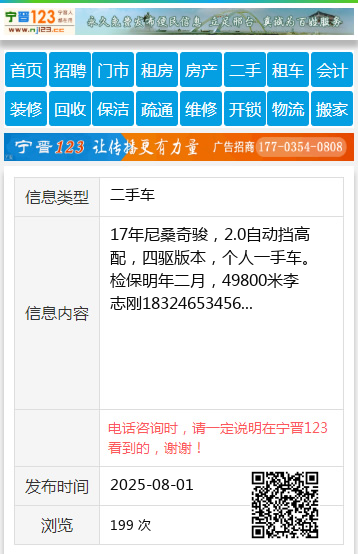 17年尼桑奇骏,2.0自动挡高配,四驱版本,个人一手车。检保明年二月,49800米李志刚18324653456