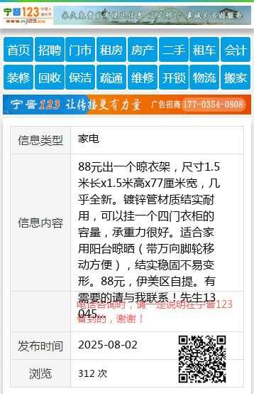 88元出一个晾衣架,尺寸1.5米长x1.5米高x77厘米宽,几乎全新。镀锌管材质结实耐用,可以挂一个四门衣柜的容量,承重力很好。适合家用阳台晾晒(带万向脚轮移动方便),结实稳固不易变形。88元,伊美区自提。有需要的请与我联系!先生13045259667 【电话咨询时,请一定说明在伊春信息网看到的,谢谢!】 |