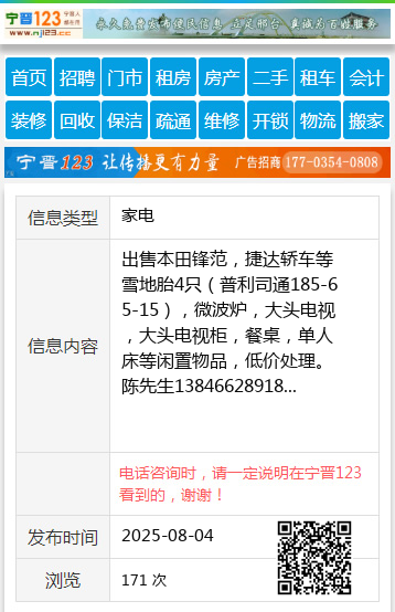出售本田锋范,捷达轿车等雪地胎4只(普利司通185-65-15),微波炉,大头电视,大头电视柜,餐桌,单人床等闲置物品,低价处理。陈先生13846628918 【电话咨询时,请一定说明在伊春信息网看到的,谢谢!】 |