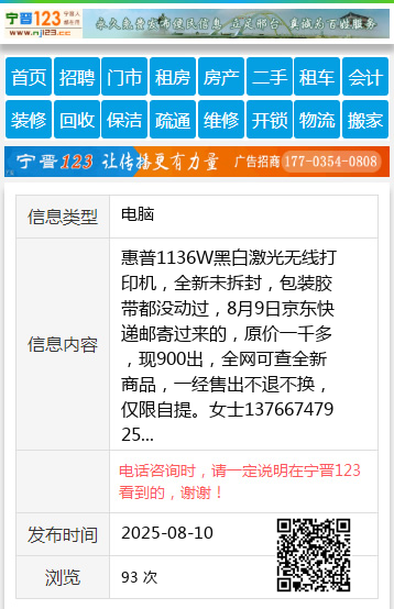 惠普1136W黑白激光无线打印机,全新未拆封,包装胶带都没动过,8月9日京东快递邮寄过来的,原价一千多,现900出,全网可查全新商品,一经售出不退不换,仅限自提。女士13766747925 【电话咨询时,请一定说明在伊春信息网看到的,谢谢!】 |