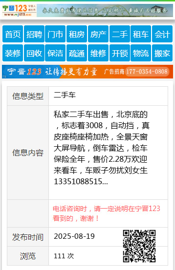 私家二手车出售,北京底的,标志着3008,自动挡,真皮座椅座椅加热,全景天窗大屏导航,倒车雷达,检车保险全年,售价2.28万欢迎来看车,车贩子勿扰刘女生13351088515 【电话咨询时,请一定说明在伊春信息网看到的,谢谢!】 |