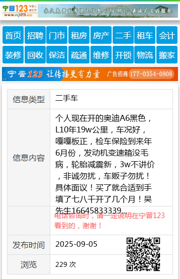 个人现在开的奥迪A6黑色,L10年19w公里,车况好,嘎嘎板正,检车保险到来年6月份,发动机变速箱没毛病,轮胎减震新,3w不讲价,非诚勿扰,车贩子勿扰!具体面议!买了就合适到手填了七八千开了几个月!吴先生16645833339 【电话咨询时,请一定说明在伊春信息网看到的,谢谢!】 |