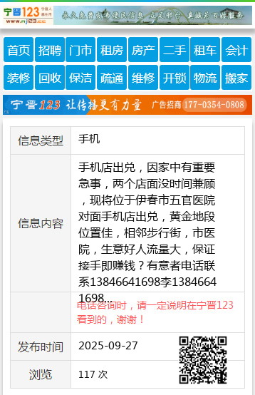 手机店出兑,因家中有重要急事,两个店面没时间兼顾,现将位于伊春市五官医院对面手机店出兑,黄金地段位置佳,相邻步行街,市医院,生意好人流量大,保证接手即赚钱?有意者电话联系13846641698李13846641698 【电话咨询时,请一定说明在伊春信息网看到的,谢谢!】 |