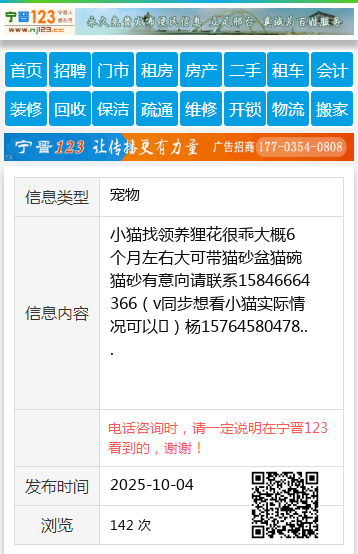 小猫找领养狸花很乖大概6个月左右大可带猫砂盆猫碗猫砂有意向请联系15846664366(v同步想看小猫实际情况可以➕)杨15764580478 【电话咨询时,请一定说明在伊春信息网看到的,谢谢!】 |