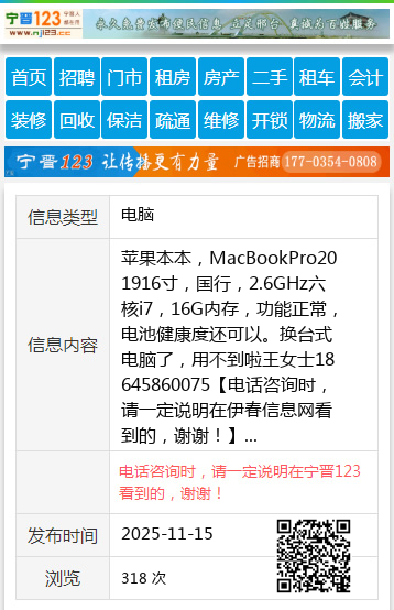 苹果本本,MacBookPro201916寸,国行,2.6GHz六核i7,16G内存,功能正常,电池健康度还可以。换台式电脑了,用不到啦王女士18645860075 【电话咨询时,请一定说明在伊春信息网看到的,谢谢!】 |