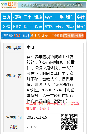 营业多年的羽绒被加工旺店转让,伊春市内独I家,位置佳,投资少见效快,一人即可营业,时间灵活自由,稳赚不赔,包教技术,提供渠道。赚钱电话:13089619747刘生13089619747 【电话咨询时,请一定说明在伊春信息网看到的,谢谢!】 |