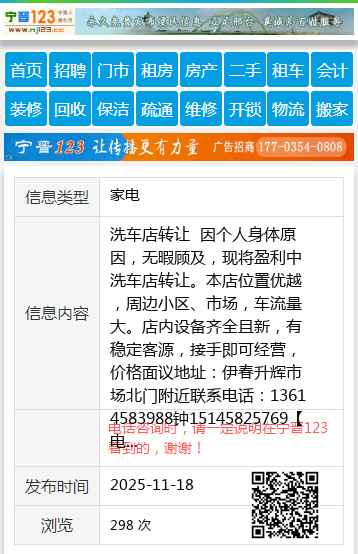 洗车店转让 因个人身体原因,无暇顾及,现将盈利中洗车店转让。本店位置优越,周边小区、市场,车流量大。店内设备齐全且新,有稳定客源,接手即可经营,价格面议地址:伊春升辉市场北门附近联系电话:13614583988钟15145825769 【电话咨询时,请一定说明在伊春信息网看到的,谢谢!】 |