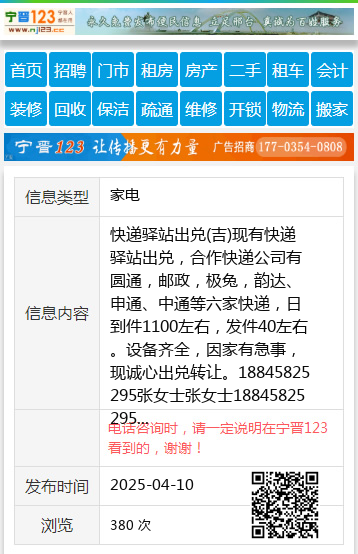 快递驿站出兑(吉)现有快递驿站出兑,合作快递公司有圆通,邮政,极兔,韵达、申通、中通等六家快递,日到件1100左右,发件40左右。设备齐全,因家有急事,现诚心出兑转让。18845825295张女士张女士18845825295