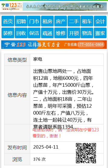 出售山葱地两处 一,占地面积12亩,地租6000元,四年山葱苗,年产15000斤山葱,产值十万元,出售价30万元。 二,占地面积18亩,二年山葱苗,明年可采摘,预估12000斤左右,产值八万元,连土地一起转让40万元,有意者请联系陈13945888680