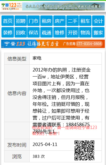 2012年办的执照,注册资金一百w,地址伊美区,经营项目图片上有,因为一直在外地,一次都没使用过,也没舍得注销,但月月报税,年年检。注销挺可惜的,现想转让,如果即可想用于经营,过户后可正常使用,有需要者请联系:18845867578孙先生18845867578 【电话咨询时,请一定说明在伊春信息网看到的,谢谢!】 |