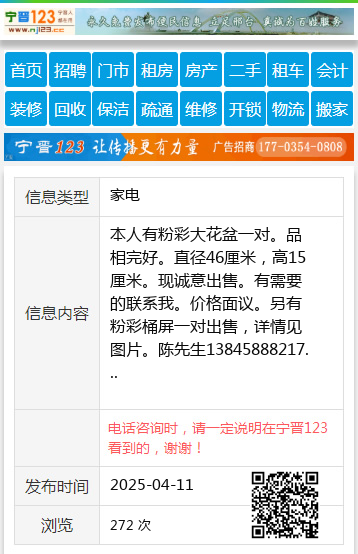 本人有粉彩大花盆一对。品相完好。直径46厘米,高15厘米。现诚意出售。有需要的联系我。价格面议。另有粉彩桶屏一对出售,详情见图片。陈先生13845888217 【电话咨询时,请一定说明在伊春信息网看到的,谢谢!】 |