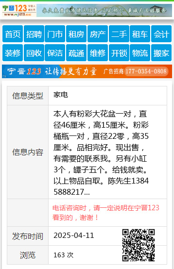 本人有粉彩大花盆一对,直径46厘米,高15厘米。粉彩桶瓶一对,直径22零,高35厘米。品相完好。现出售,有需要的联系我。另有小缸3个,罈子五个。给钱就卖。以上物品自取。陈先生13845888217