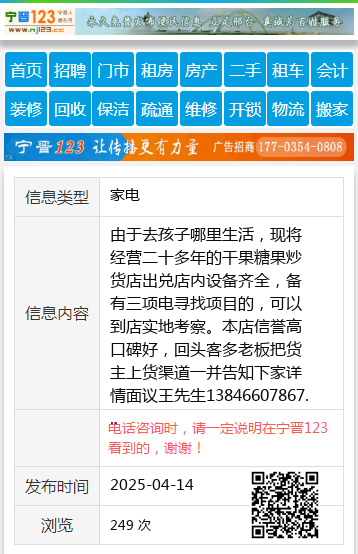 由于去孩子哪里生活,现将经营二十多年的干果糖果炒货店出兑店内设备齐全,备有三项电寻找项目的,可以到店实地考察。本店信誉高口碑好,回头客多老板把货主上货渠道一并告知下家详情面议王先生13846607867