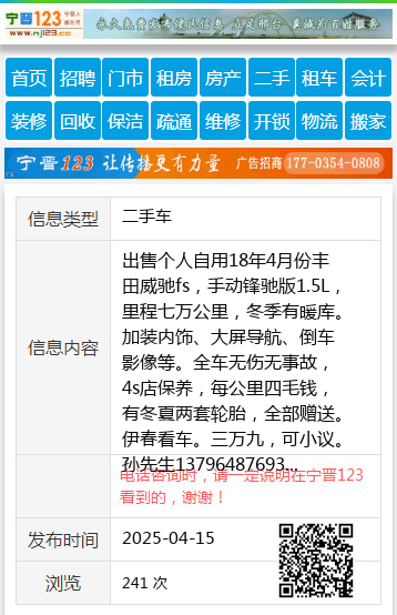 出售个人自用18年4月份丰田威驰fs,手动锋驰版1.5L,里程七万公里,冬季有暖库。加装内饰、大屏导航、倒车影像等。全车无伤无事故,4s店保养,每公里四毛钱,有冬夏两套轮胎,全部赠送。伊春看车。三万九,可小议。孙先生13796487693 【电话咨询时,请一定说明在伊春信息网看到的,谢谢!】 |