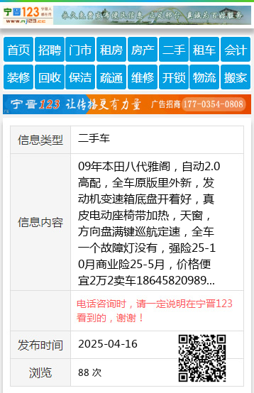 09年本田八代雅阁,自动2.0高配,全车原版里外新,发动机变速箱底盘开着好,真皮电动座椅带加热,天窗,方向盘满键巡航定速,全车一个故障灯没有,强险25-10月商业险25-5月,价格便宜2万2卖车18645820989 【电话咨询时,请一定说明在伊春信息网看到的,谢谢!】 |