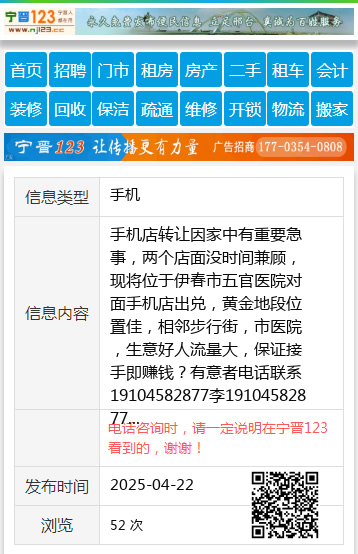手机店转让因家中有重要急事,两个店面没时间兼顾,现将位于伊春市五官医院对面手机店出兑,黄金地段位置佳,相邻步行街,市医院,生意好人流量大,保证接手即赚钱?有意者电话联系19104582877李19104582877