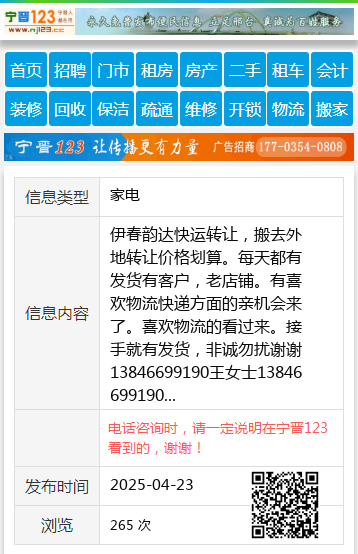 伊春韵达快运转让,搬去外地转让价格划算。每天都有发货有客户,老店铺。有喜欢物流快递方面的亲机会来了。喜欢物流的看过来。接手就有发货,非诚勿扰谢谢13846699190王女士13846699190 【电话咨询时,请一定说明在伊春信息网看到的,谢谢!】 |
