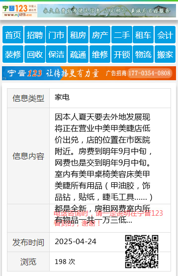因本人夏天要去外地发展现将正在营业中美甲美睫店低价出兑,店的位置在市医院附近。房费到明年9月中旬,网费也是交到明年9月中旬。室内有美甲桌椅美容床美甲美睫所有用品(甲油胶,饰品钻,贴纸,睫毛工具……)都是全新,房租网费室内所有物品一共一万三低价出兑有意者电话联系15765999156女士15765999156