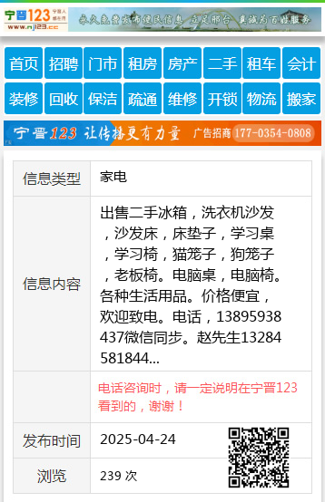 出售二手冰箱,洗衣机沙发,沙发床,床垫子,学习桌,学习椅,猫笼子,狗笼子,老板椅。电脑桌,电脑椅。各种生活用品。价格便宜,欢迎致电。电话,13895938437微信同步。赵先生13284581844 【电话咨询时,请一定说明在伊春信息网看到的,谢谢!】 |