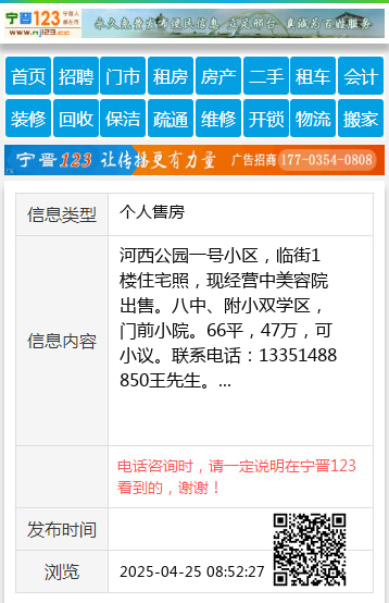 河西公园一号小区,临街1楼住宅照,现经营中美容院出售。八中、附小双学区,门前小院。66平,47万,可小议。联系电话:13351488850王先生。 【电话咨询时,请一定说明在伊春信息网看到的,谢谢!】 |