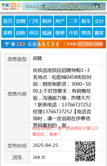 化妆品连锁店招聘导购1~3名地点:松韵城0458街区时间:倒班制薪资:3000~5000上不封顶要求:有销售经验,沟通能力强,热情大方!联系电话:13766727252经理13766727252 【电话咨询时,请一定说明在伊春信息网看到的,谢谢!】 |