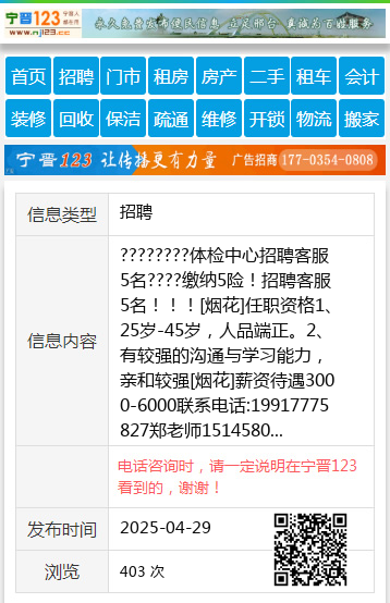 ????????体检中心招聘客服5名????缴纳5险!招聘客服5名!!![烟花]任职资格1、25岁-45岁,人品端正。2、有较强的沟通与学习能力,亲和较强[烟花]薪资待遇3000-6000联系电话:19917775827郑老师15145806607 【电话咨询时,请一定说明在伊春信息网看到的,谢谢!】 |