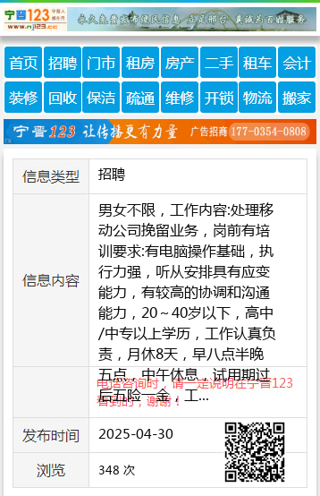 男女不限,工作内容:处理移动公司挽留业务,岗前有培训要求:有电脑操作基础,执行力强,听从安排具有应变能力,有较高的协调和沟通能力,20~40岁以下,高中/中专以上学历,工作认真负责,月休8天,早八点半晚五点,中午休息,试用期过后五险一金,工资待遇:底薪+绩效电话咨询:138959306265月6日后打电话面试工作地点:伊春市移动公司张女士13895930626 【电话咨询时,请一定说明在伊春信息网看到的,谢谢!】 |