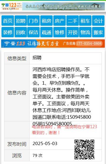 河西炸鸡店招聘操作员。不需要会技术,手把手一学就会。1、早9点到晚9点。。每月两天休息。操作简单,工资面议。主要做美团外卖单子。工资面议,每月两天休息工作地点:河西妇联幼儿园道口联系电话:15094580005明15094580005 【电话咨询时,请一定说明在伊春信息网看到的,谢谢!】 |
