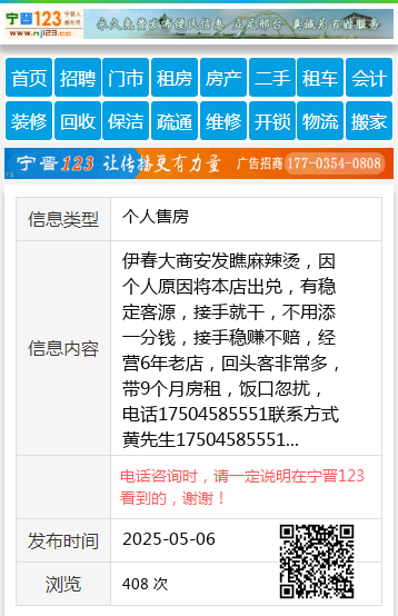 伊春大商安发瞧麻辣烫,因个人原因将本店出兑,有稳定客源,接手就干,不用添一分钱,接手稳赚不赔,经营6年老店,回头客非常多,带9个月房租,饭口忽扰,电话17504585551联系方式黄先生17504585551 【电话咨询时,请一定说明在伊春信息网看到的,谢谢!】 |