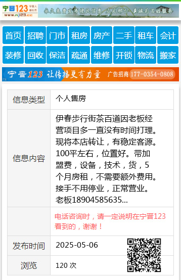 伊春步行街茶百道因老板经营项目多一直没有时间打理。现将本店转让,有稳定客源。100平左右,位置好。带加盟费,设备,技术,货,5个月房租,不需要额外费用。接手不用停业,正常营业。老板18904585635 【电话咨询时,请一定说明在伊春信息网看到的,谢谢!】 |