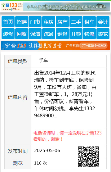 出售2014年12月上牌的现代瑞纳,检车到年底,保险到9月,车没有大伤,省油,由于置换新车,1。28万元出售,价格可议,新青看车,午休时间勿扰。李先生13329489900 【电话咨询时,请一定说明在伊春信息网看到的,谢谢!】 |