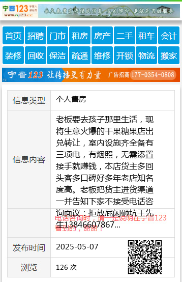 老板要去孩子那里生活,现将生意火爆的干果糖果店出兑转让,室内设施齐全备有三项电,有烟照,无需添置接手就赚钱,本店货主多回头客多口碑好多年老店知名度高。老板把货主进货渠道一并告知下家不接受电话咨询面议:拒放屁闲砸坑王先生13846607867 【电话咨询时,请一定说明在伊春信息网看到的,谢谢!】 |