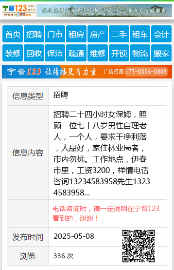 招聘二十四小时女保姆,照顾一位七十八岁男性自理老人,一个人,要求干净利落,人品好,家住林业局者,市内勿扰。工作地点,伊春市里,工资3200,祥情电话咨询13234583958先生13234583958 【电话咨询时,请一定说明在伊春信息网看到的,谢谢!】 |