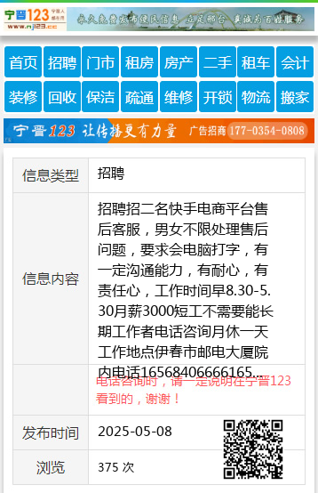 招聘招二名快手电商平台售后客服,男女不限处理售后问题,要求会电脑打字,有一定沟通能力,有耐心,有责任心,工作时间早8.30-5.30月薪3000短工不需要能长期工作者电话咨询月休一天工作地点伊春市邮电大厦院内电话1656840666616568408888王先生16568406666 【电话咨询时,请一定说明在伊春信息网看到的,谢谢!】 |