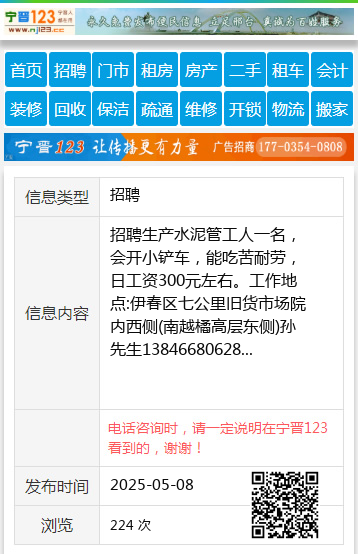 招聘生产水泥管工人一名,会开小铲车,能吃苦耐劳,日工资300元左右。