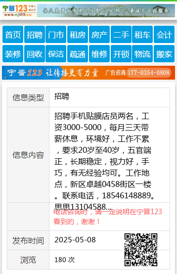 招聘手机贴膜店员两名,工资3000-5000,每月三天带薪休息,环境好,工作不累,要求20岁至40岁,五官端正,长期稳定,视力好,手巧,有无经验均可。工作地点,新区卓越0458街区一楼。联系电话,18546148889。思思13104588089