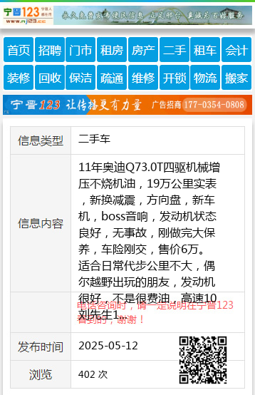 11年奥迪Q73.0T四驱机械增压不烧机油,19万公里实表,新换减震,方向盘,新车机,boss音响,发动机状态良好,无事故,刚做完大保养,车险刚交,售价6万。适合日常代步公里不大,偶尔越野出玩的朋友,发动机很好,不是很费油,高速10刘先生13846623258 【电话咨询时,请一定说明在伊春信息网看到的,谢谢!】 |