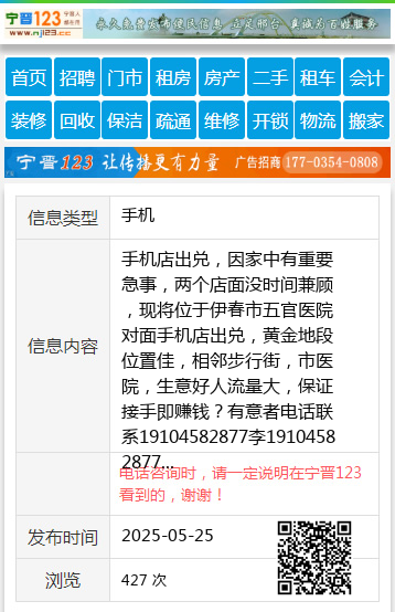 手机店出兑,因家中有重要急事,两个店面没时间兼顾,现将位于伊春市五官医院对面手机店出兑,黄金地段位置佳,相邻步行街,市医院,生意好人流量大,保证接手即赚钱?有意者电话联系19104582877李19104582877 【电话咨询时,请一定说明在伊春信息网看到的,谢谢!】 |
