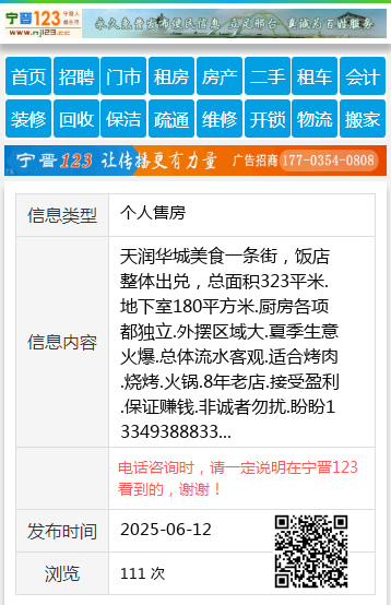 天润华城美食一条街,饭店整体出兑,总面积323平米.地下室180平方米.厨房各项都独立.外摆区域大.夏季生意火爆.总体流水客观.适合烤肉.烧烤.火锅.8年老店.接受盈利.保证赚钱.非诚者勿扰.盼盼13349388833 【电话咨询时,请一定说明在伊春信息网看到的,谢谢!】 |