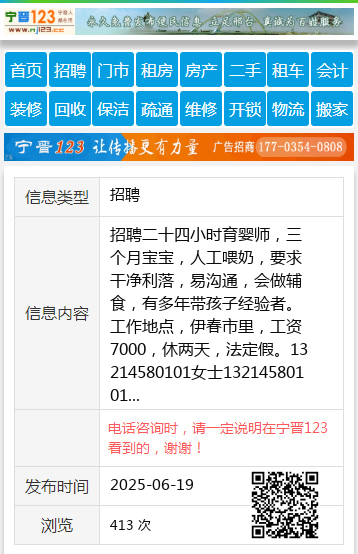 招聘二十四小时育婴师,三个月宝宝,人工喂奶,要求干净利落,易沟通,会做辅食,有多年带孩子经验者。工作地点,伊春市里,工资7000,休两天,法定假。13214580101女士13214580101 【电话咨询时,请一定说明在伊春信息网看到的,谢谢!】 |