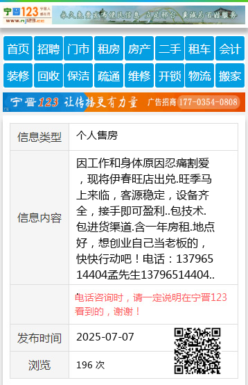 因工作和身体原因忍痛割爱,现将伊春旺店出兑.旺季马上来临,客源稳定,设备齐全,接手即可盈利..包技术.包进货渠道.含一年房租.地点好,想创业自己当老板的,快快行动吧!电话:13796514404孟先生13796514404 【电话咨询时,请一定说明在伊春信息网看到的,谢谢!】 |
